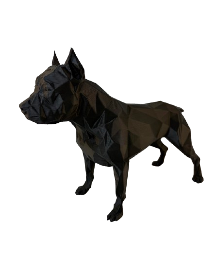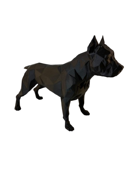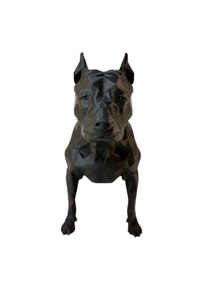 Изключителна 3D фигура на питбул, изработена с внимание към всеки детайл от висококачествен PLA материал. Дизайнът е с полигона форма, която подчертава мощната и елегантна стойка на породата, придавайки ѝ модерен, арт вид. Фигурата е лека, устойчива и подходяща както за декорация в дома или офиса, така и като подарък за любители на кучета и фенове на 3D печата.