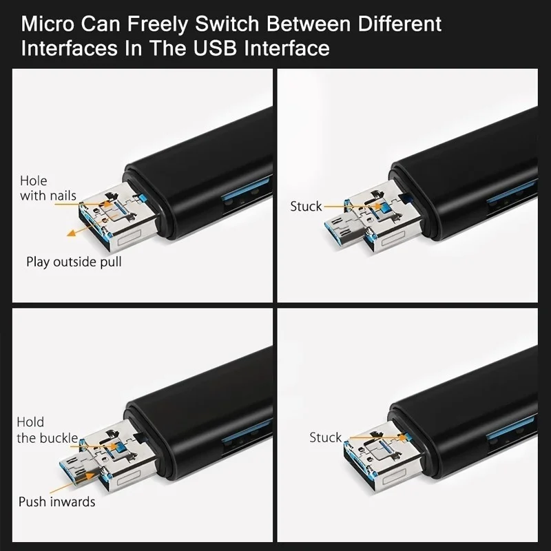 Практичен и компактен 5 в 1 мултифункционален четец за карти, който ви позволява лесно да прехвърляте, съхранявате и достъпвате данни между различни устройства. Съвместим с широка гама от смартфони, таблети и компютри, благодарение на наличието на Type-C, стандартен USB и Micro USB конектори. Поддържа OTG функция, което позволява директно свързване към мобилни устройства без нужда от допълнителен софтуер. Идеален за бързо прехвърляне на снимки, видеа и файлове от SD и TF карти.