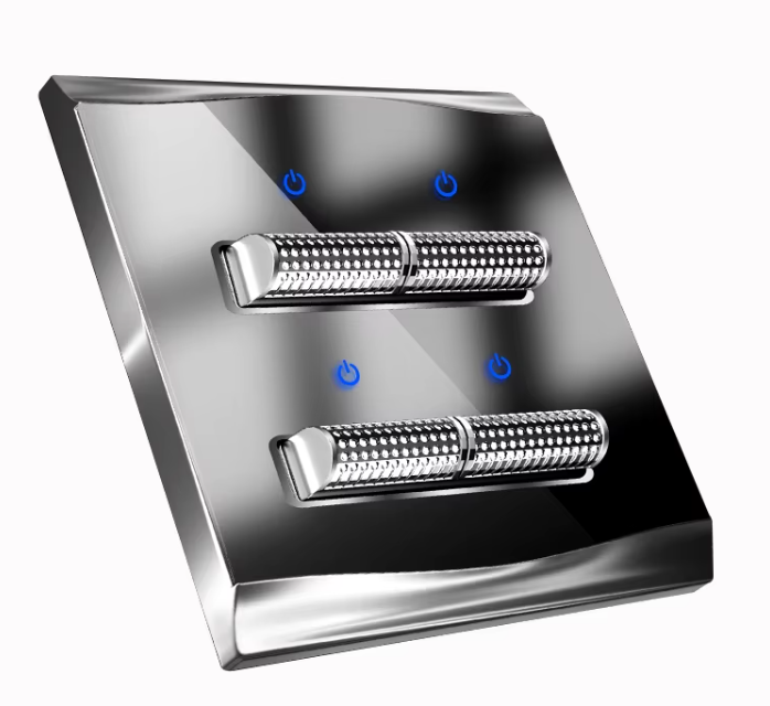 Модерен стенен ключ с елегантен панел от закалено стъкло и метални въртящи се бутони, които придават луксозен и съвременен вид на интериора. Вградените сини LED индикатори осигуряват лесна ориентация на тъмно, без да дразнят очите. Здравата конструкция и висококачествените материали гарантират дълготрайна и безопасна употреба. Подходящ е за домове, хотели и модерни интериорни пространства, като съчетава стил, функционалност и удобство.