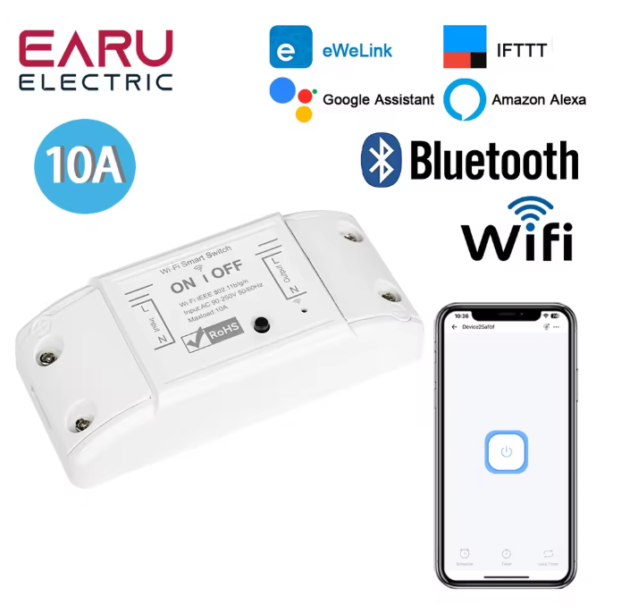 Този 10A DIY мини WiFi смарт ключ ви позволява лесно да превърнете традиционните си ключове и устройства в интелигентни. Можете безжично да контролирате светлини и електроуреди чрез смартфона си или с гласови команди чрез Alexa и Google Home. Модулът работи с AC 90–250V и може да управлява разнообразни осветителни тела и уреди. Контролира се директно чрез Wi-Fi 2.4GHz без необходимост от отделен хъб и чрез популярното приложение eWeLink за Android и iOS. Множество опции за програмиране позволяват автоматично включване и изключване на светлини, вентилатори и други устройства в точно зададено време. Инсталирането е лесно: просто свържете модула между устройството и захранването, за да превърнете почти всяко съвместимо устройство в „смарт“.