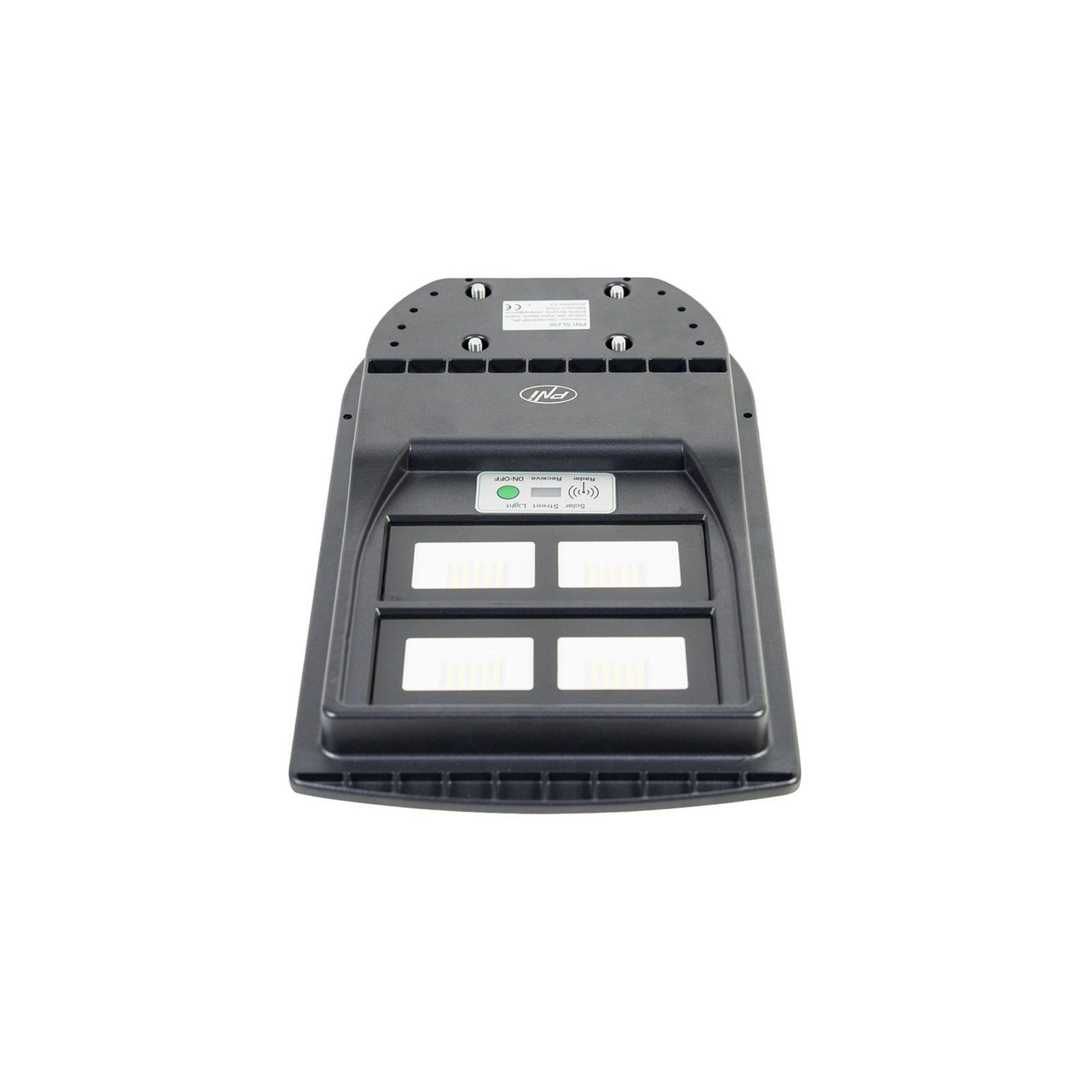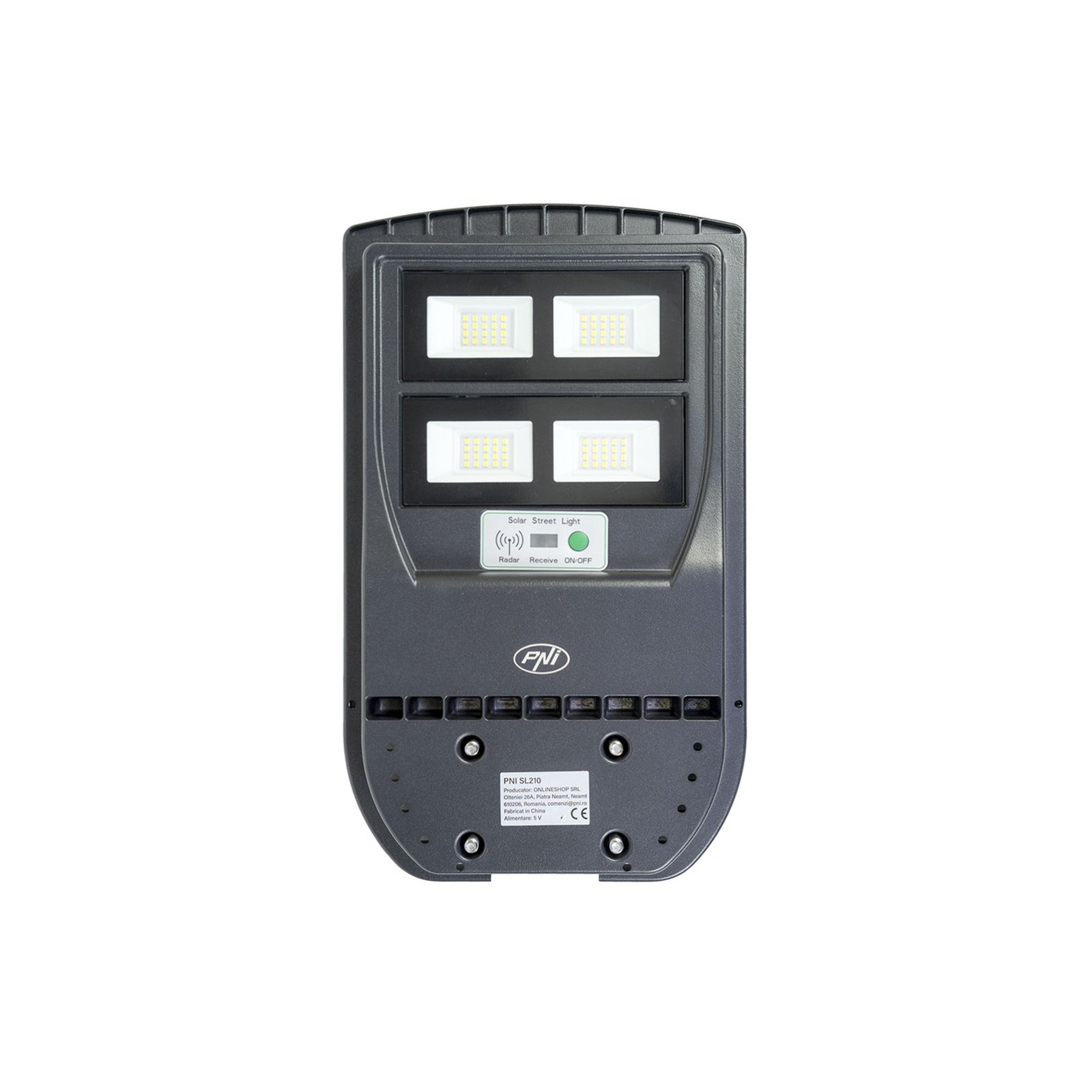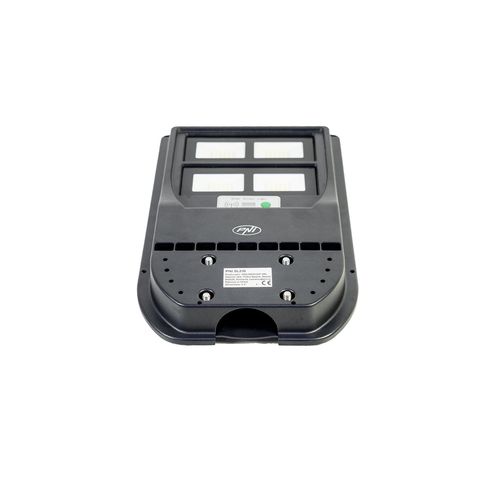 Лампата за улично осветление PNI SL210 с обща LED мощност 6,5 W е устойчиво решение за осветление на външни площи (улици, паркове, градини), оборудвана е със соларен панел с мощност 10 W и две батерии по 10 Ah, осигуряващи енергийна автономност.